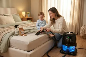 Vyhněte se agresivním chemikáliím, které by mohly dráždit dětskou kůži nebo způsobit alergie. Vždy si nové čisticí prostředky otestujte jen na malém kousku matrace. A pokud máte doma vodní vysavač Hyla, je to skvělá volba – nejen čistí, ale i filtruje vzduch, což přispívá k zdravému spánku pro celou rodinu.